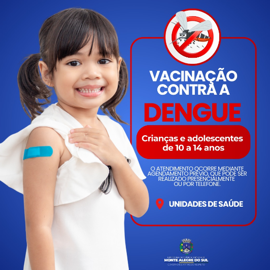 A Prefeitura de Monte Alegre do Sul, por meio do Departamento de Saúde, inicia nesta sexta-feira, 16 de janeiro, a Campanha de Vacinação contra a Dengue voltada a crianças e adolescentes do município, conforme as diretrizes estabelecidas pelo Ministério da Saúde. O público-alvo da campanha são crianças e adolescentes de 10 a 14 anos de idade. O esquema vacinal prevê a aplicação de duas doses, com intervalo de três meses entre a primeira e a segunda dose. A vacina estará disponível nas três Unidades de Saúde do município: Central, Limas e Mostardas. O atendimento ocorre mediante agendamento prévio, que pode ser realizado presencialmente ou por telefone, diretamente nas Unidades de Saúde da Família: Unidade de Saúde Central: (19) 3899-1300 Unidade de Saúde Limas: (19) 3174-0000 Unidade de Saúde Mostardas: (19) 3899-1193 Em caso de dúvidas ou para mais informações, os responsáveis devem procurar a unidade de saúde mais próxima. A Prefeitura de Monte Alegre do Sul reforça a importância da vacinação como uma medida essencial para a proteção da saúde.