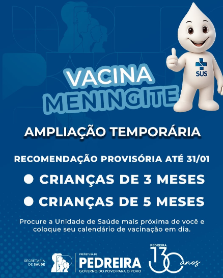 A Secretaria Municipal de Saúde de Pedreira informa a ampliação temporária da oferta da vacina Meningite ACWY. Essa medida é provisória e válida até 31 de janeiro de 2026.Segundo informou o Departamento de Vigilância Epidemiológica a vacinação é uma das formas mais eficazes de prevenção contra doenças graves. “Manter as vacinas de rotina em dia protege a criança, o adolescente e toda a comunidade. A ampliação reforça essa proteção em uma fase importante da vida”, destaca a coordenadora Isabel Cristina dos Santos Lima.Devem ser vacinadas durante a ampliação temporária, crianças de 3 meses e crianças de 5 meses. Vacinação de rotina continua normalmente com o reforço para crianças com 12 meses (1 ano) e reforço para adolescentes de 11 anos até 14 anos, 11 meses e 29 dias.A vacina Meningite ACWY protege contra formas graves da meningite. A doença pode evoluir rapidamente e causar complicações sérias, por isso, a prevenção é fundamental.Procure a Unidade de Saúde mais próxima de você, leve o Calendário de Vacinação e mantenha as doses em dia. GLAUCO MAZZETTO – JORNALISTA MTB 35022